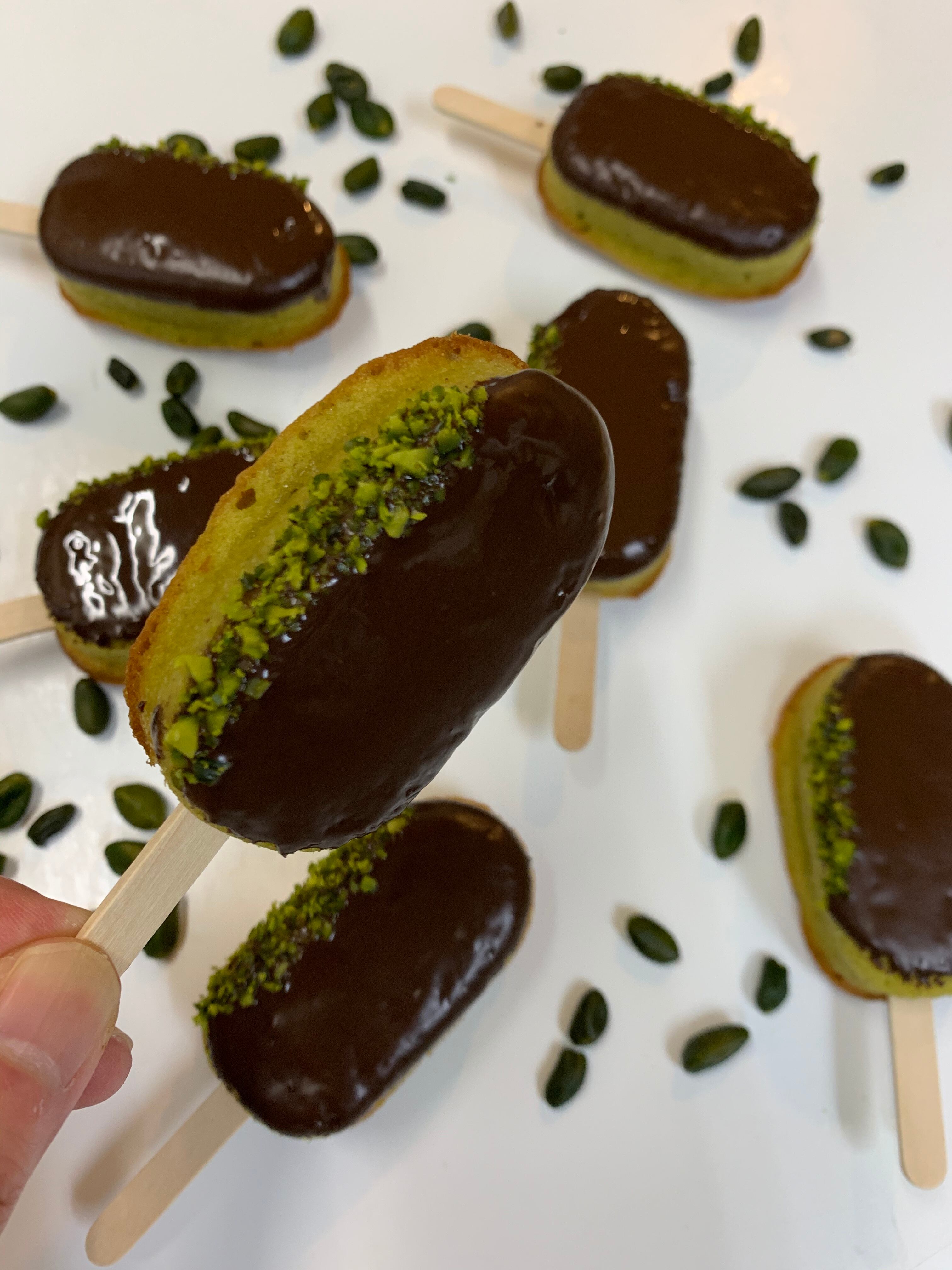 ピスタチオレモン バター、卵、砂糖、小麦粉、ピスタチオペースト、レモンピール、ピスタチオパウダー、コーティングチョコ、洋酒、ベーキングパウダー